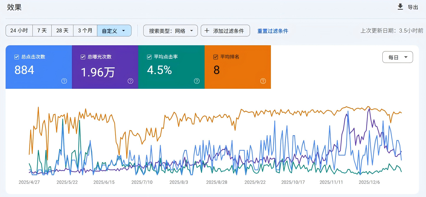 在未进行品牌投放、未依赖品牌搜索的前提下,截至当前,网站在 Google 自然搜索中的整体数据如下: