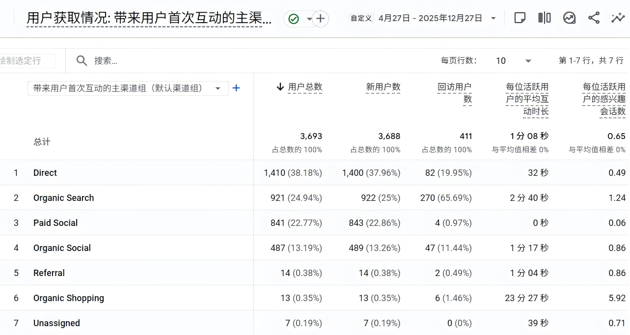 *在主要获客渠道中,自然搜索用户的停留时长处于较高水平,明显优于 Direct、Paid Social、Organic Social 等渠道