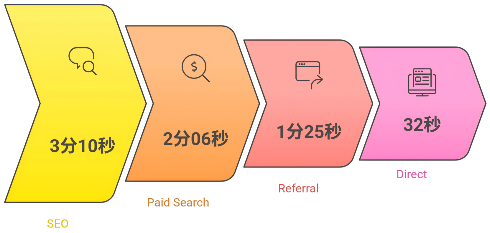 互动时长霸榜第一: SEO 来源的用户平均互动时长高达 3分10秒,位居全渠道之首。这比花钱买来的谷歌广告流量(2分06秒)还要多出 1分钟以上,更是直接访问(32秒)的 6倍。