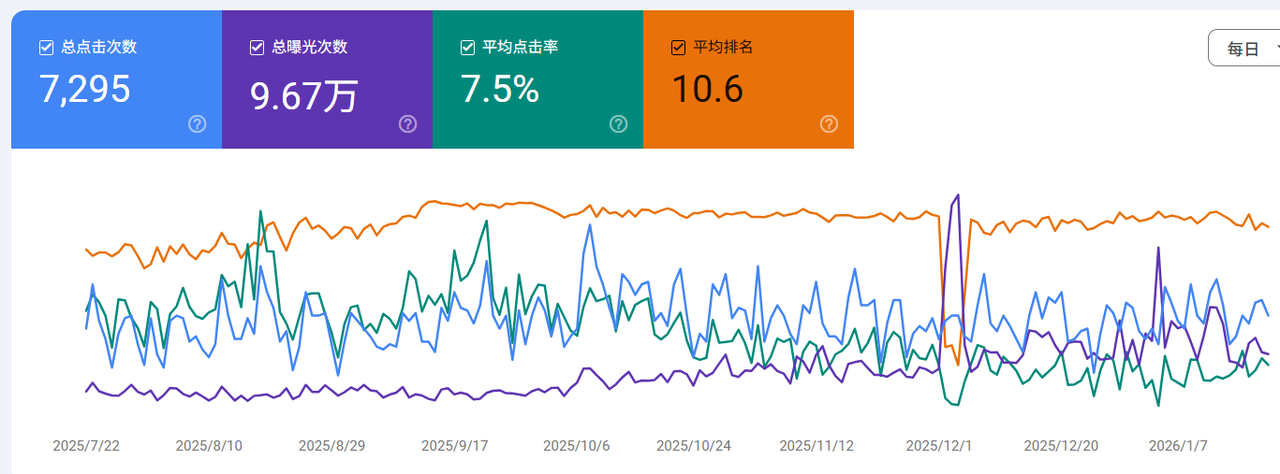 点击率(CTR)高达 7.5% 这一数据远超电商行业 2%-3% 的平均水平。这直接证明了我们的 Meta Title 和 Description 优化极具“杀伤力”,文案精准击中了用户痛点,在激烈的竞争中诱发了极高的点击意愿。
