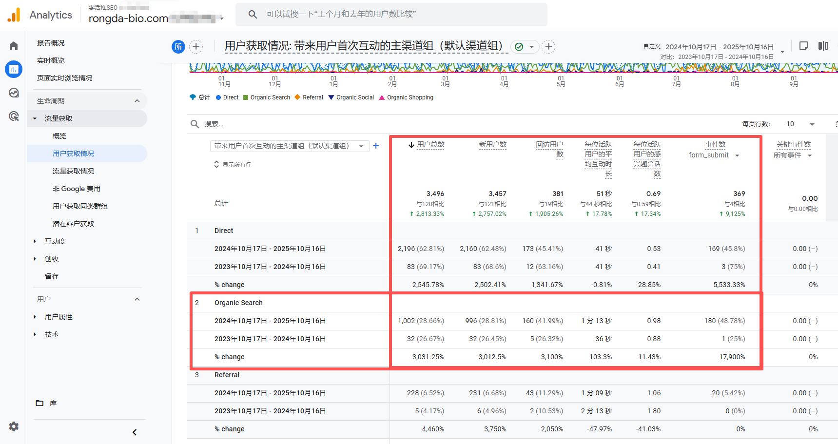 • 用户规模实现量级突破:用户数增加,表明SEO优化解决了官网自然搜索曝光难题,成功触达更多全球生命科学领域的潜在客户,原本自然搜索获客范围狭窄的局面被打破,潜在客户覆盖广度大幅提升。