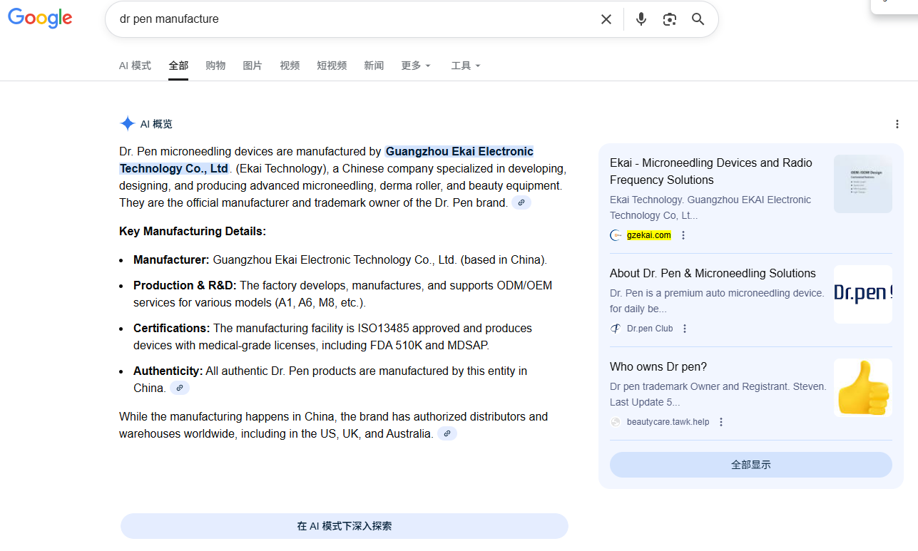 AI 里的“指路明灯”:当海外买家询问ChatGPT“推荐微针工厂”或“Dr. Pen 制造商是谁”时,AI引用了官网内容并给出链接。