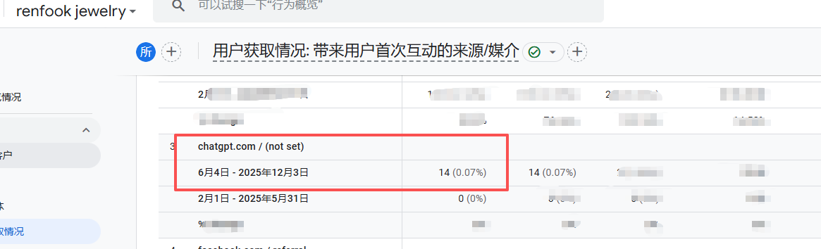 在本轮SEO优化过程中,网站已在GA数据中出现 来自ChatGPT的访问来源。表明网站内容、页面信息或品牌主题,已经有机会被 AI 工具用户触达,说明网站不再只是面向传统搜索结果展示,也开始进入 AI 搜索与生成式推荐场景。