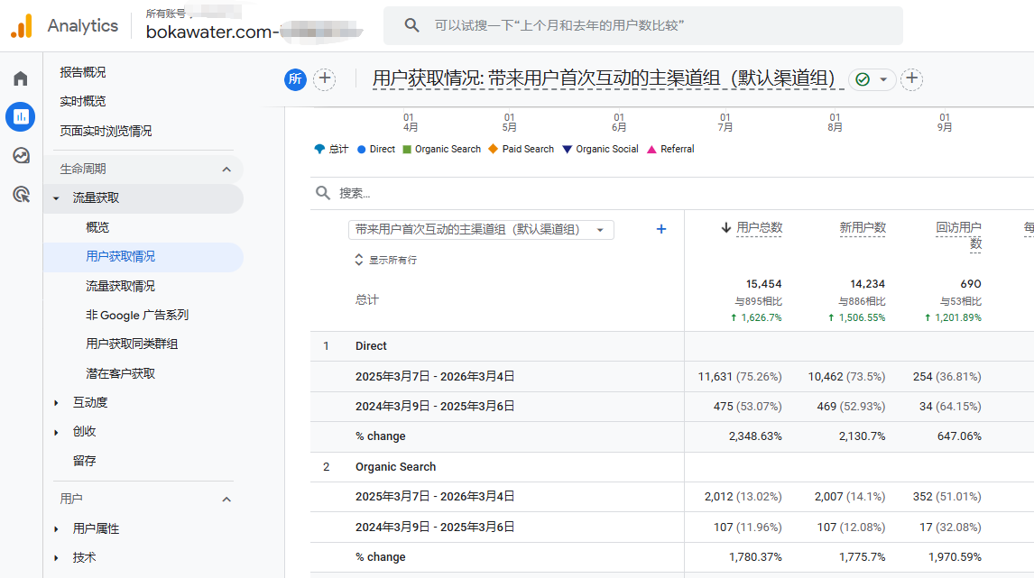 通过对比SEO优化前后的流量数据进行回溯对比,BokaWater网站在自然搜索(Organic Search)渠道实现了结构性的量级突破。SEO策略不仅显著提升了品牌在全球市场的获客基数,更在受众意向精准度与站内互动质量上建立了稳固的市场壁垒。